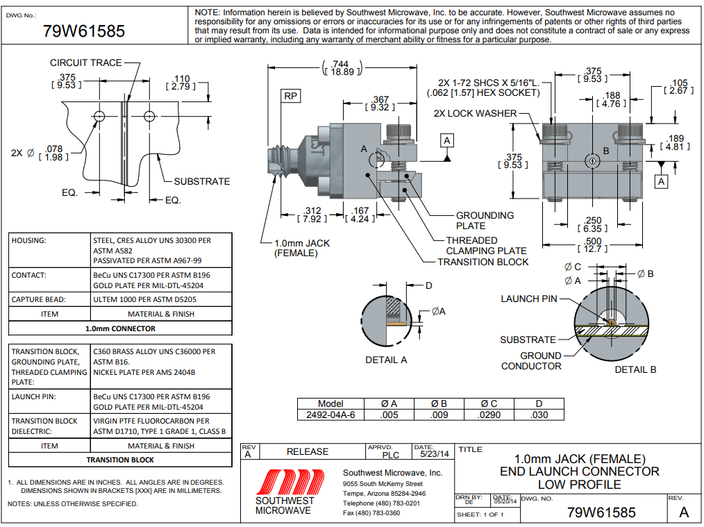 引腳/電物料內直徑:0.005 / 0.0290