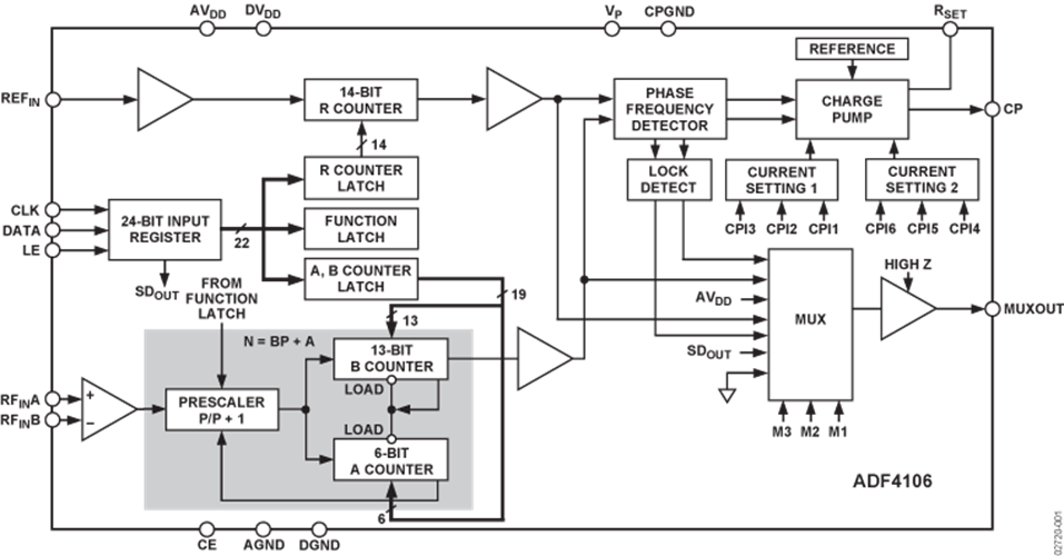 ADF4106頻段人工器在wlan接收入機和射出機的上交流直流變頻和下交流直流變頻位置中,快速可用來體現本振。它由低噪音污染數字6鑒頻鑒相器(PFD)、精密機械正電荷泵、可程序編程序規范分頻器、可程序編程序A和B篩選法器及雙模預分頻器(P/P+1)分解成。A(6位)、B(13位)篩選法器與雙模預分頻器(P/P+1)搭配,可體現N分頻器(N = BP + A)。凡此種種,14位規范分頻器(R分頻器)準許PFD輸入新風裝置的REFIN頻段為應該值。只要頻段人工器與兩個外表環路濾波器和電阻值管控自激振蕩器(VCO)一個食用,則應該體現完整性的鎖相環(PLL)。其上行速率不高,往往不少中頻裝置應該免去了倍頻器,若想優化裝置架構設計并消減投資成本。