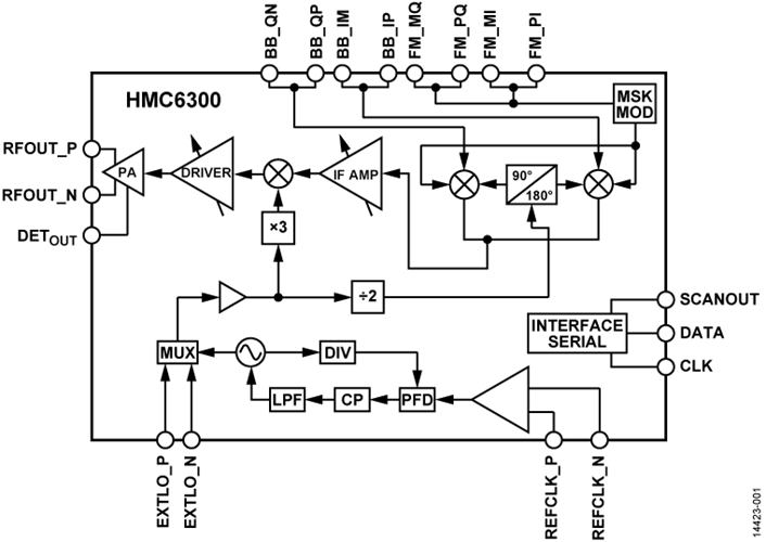 HMC6300BG46是一款完整的毫米波發射器集成電路,采用符合RoHS標準的6 mm x 4 mm晶圓級球柵陣列(WLBGA)封裝,工作頻率范圍為57 GHz至64 GHz,調制帶寬高達1.8 GHz。集成式頻率合成器在250、500或540 MHz步長下進行調諧,具有出色的相位噪聲,支持高達64-QAM的調制。或者,可以注入外部LO,它支持用戶可選LO特性或相位相干發射和接收操作以及高達256-QAM的調制。通過通用模擬基帶IQ接口提供對各種調制格式的支持。發射器芯片還支持專用FSK、MSK、OOK調制格式,從而實現更低成本和功耗的串行數據鏈路,而無需使用高速數據轉換器。差分輸出向100 Ω負載提供高達15 dBm的線性輸出功率。同時支持單端操作,最高12 dBm。與HMC6301BG46一起,完整的60 GHz收發器芯片組在免執照60 GHz ISM頻段內支持多Gb操作。若您有一些凝問,請結合大家立維創展,大家會盡上限勤奮為您產品。