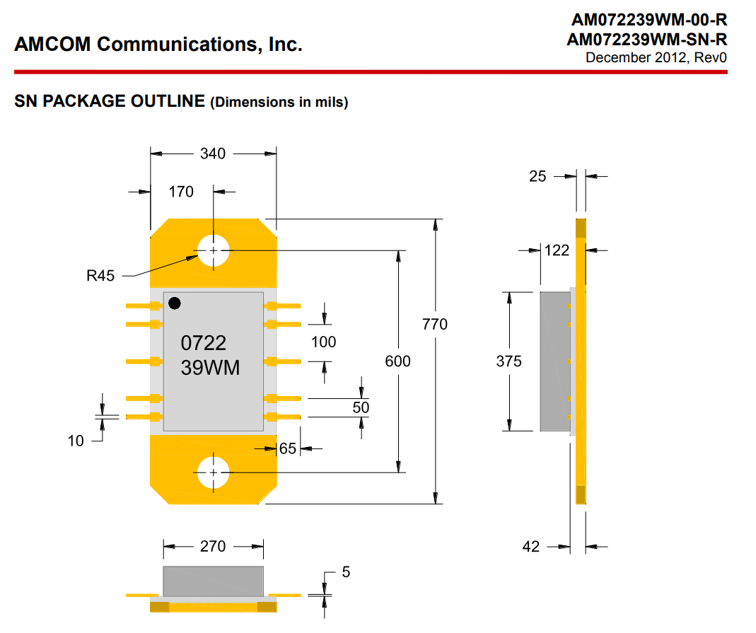 AMCOM的AM072239WM-SN-R是帶寬GaAs MMIC最大功率縮放器。它全是個30dB小信息增加收益和39 dBm(8W)呈現飽和狀態輸入輸出的功率CW耐腐蝕性工作效率少于0.7至2.2GHz頻段。MMIC在兩種IC芯片(-00—R)中展示。包(-SN-R)表單控件。AM072249WM SN-R是衛浴陶瓷芯片封裝中的種。蝶閥法蘭和直RF和DC會造成配備回落。由直流電源功效高耗散,良好的的排熱是必要的,心片MMIC一定裝有用到會在輕金屬脊上進心行共晶釬焊。電源芯片和封口都在ROHS妥協的